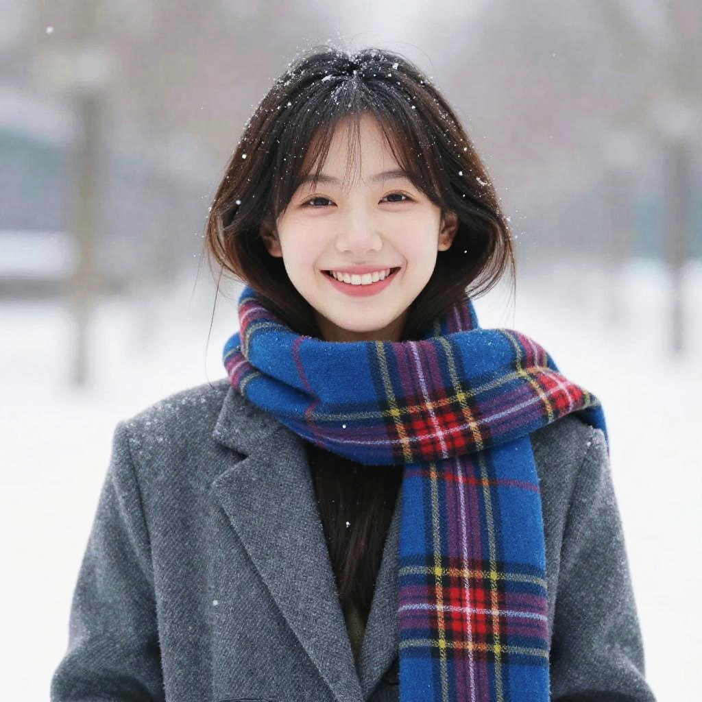A happy young woman smiling and wearing a Sweater dress with woolen leg warmers in snowy weather, soft natural lighting, snowflakes falling around, winter atmosphere, blue and gray color tones