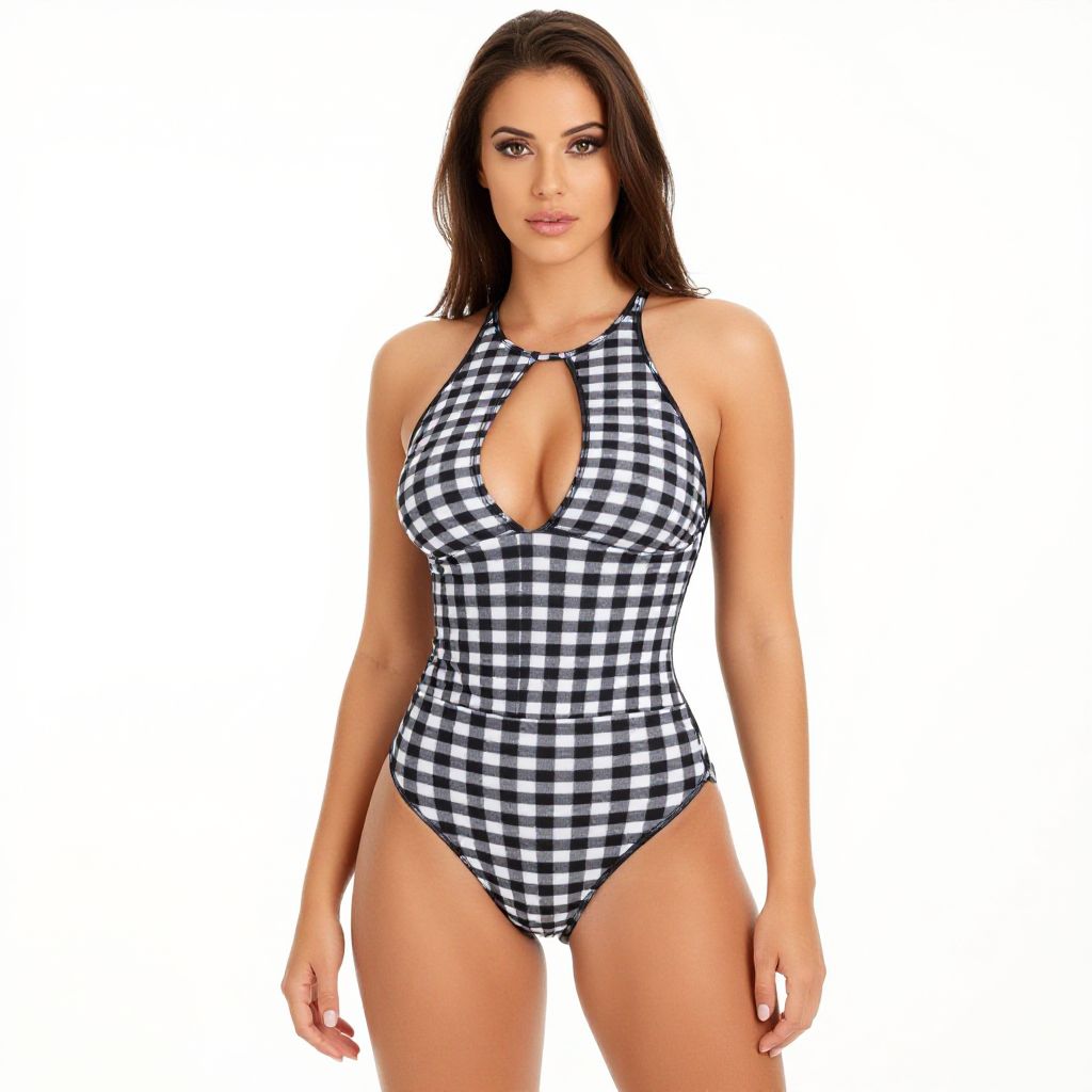 "Woman, modern swimwear, black and white checkered one-piece swimsuit, halter neck, plunging neckline with a keyhole cutout, high-cut leg silhouette, white backdrop in a photo studio setting.. Sexy. Pretty face and beаutiful eyes. Big breasts."
