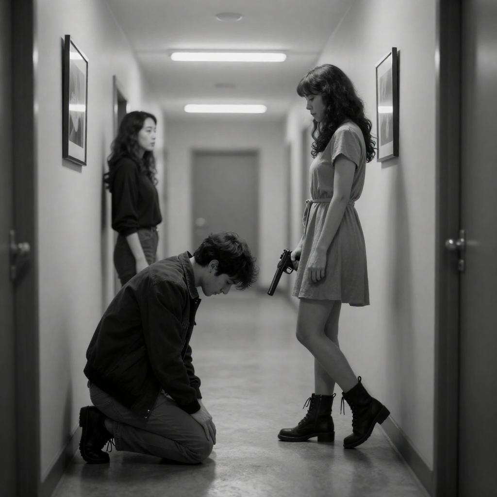 Noir Hallway Confrontation Woman with Gun