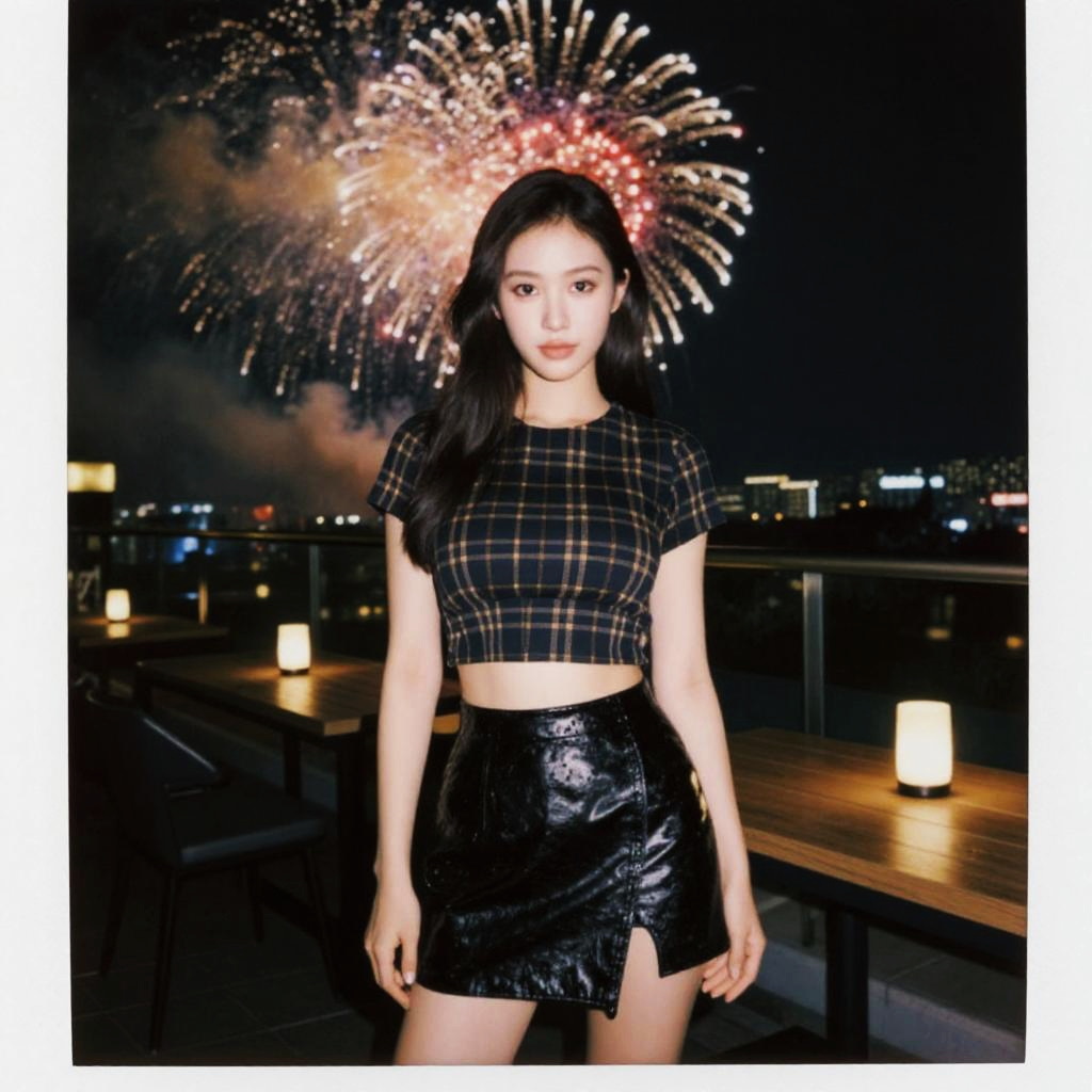 A lean woman in a chic short-sleeved black and gold plaid crop top and an asymmetrical black faux leather skirt stands on a rooftop dining area, surrounded by a vibrant fireworks display. Visual style: Instant film. Sexy. Pretty face and beаutiful eyes. Big breasts