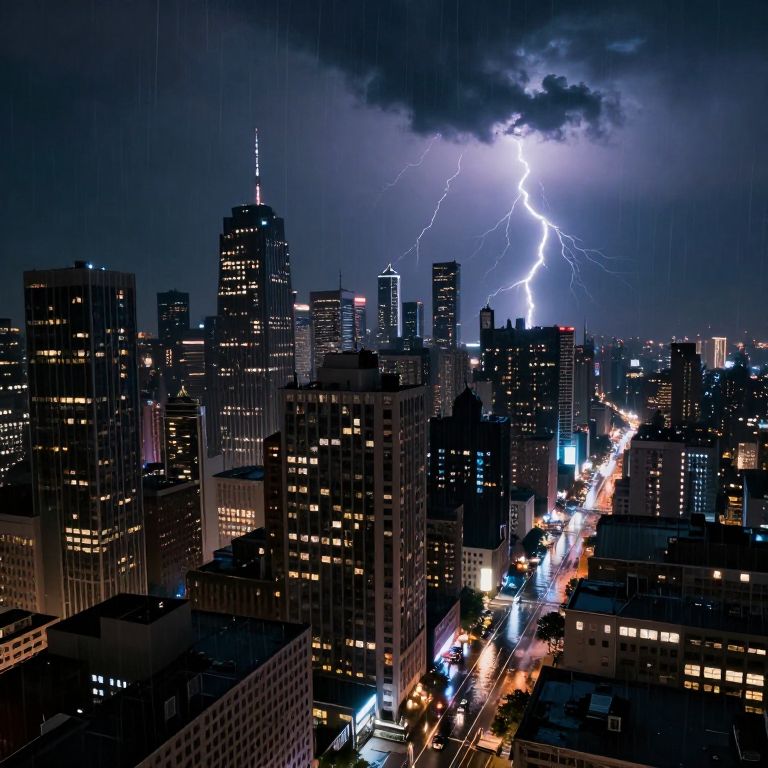Photograph of a city skyline at night, illuminated by bright lightning bolt in a dark, stormy sky, with city lights and traffic below.