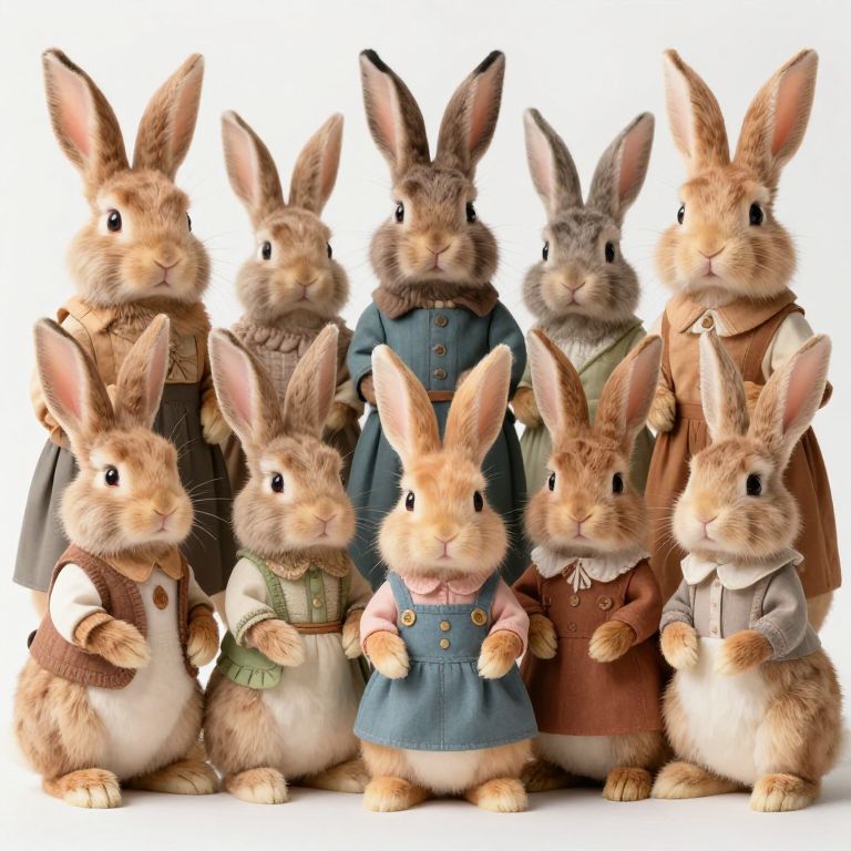 A whimsical assembly of anthropomorphic rabbits, each uniquely posed and adorned, defies the ordinary by seamlessly blending animal charm with human-like postures and attire, creating a fantastical world where nature meets imagination.