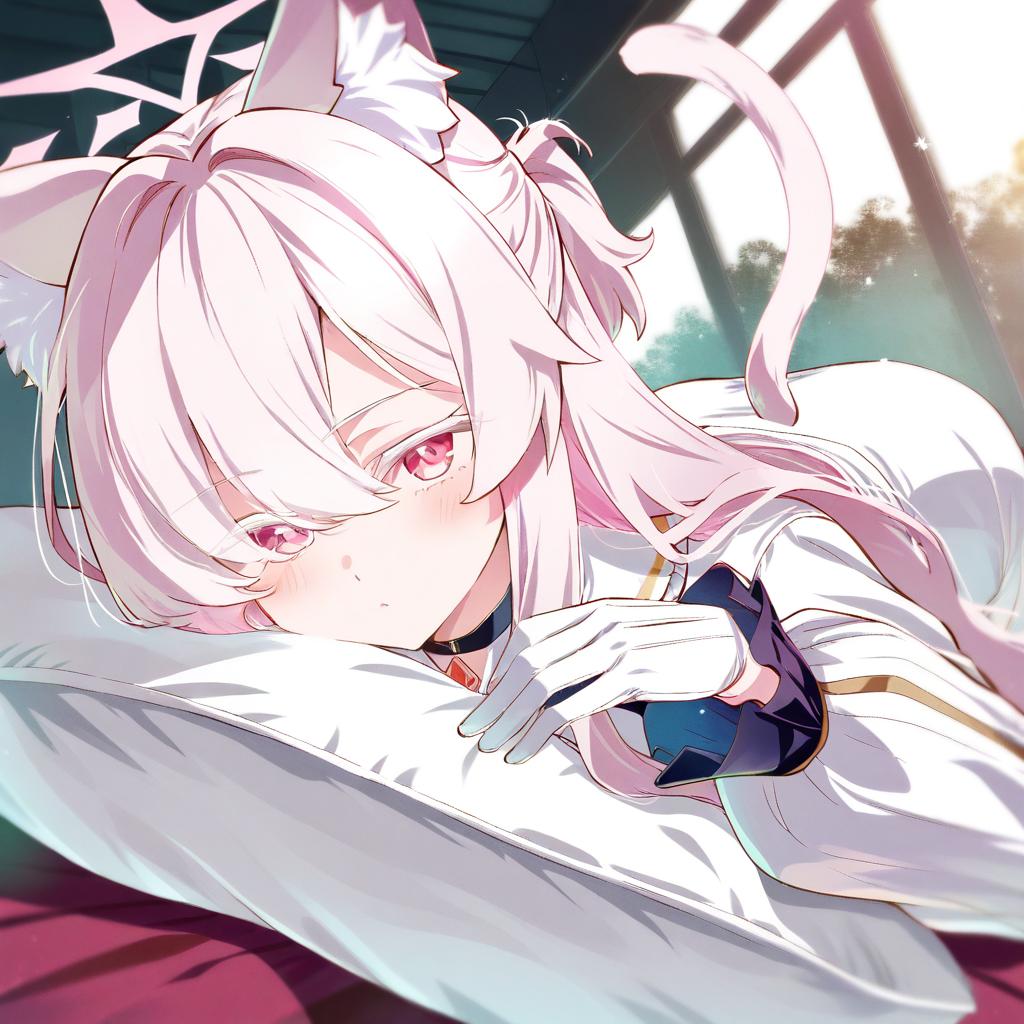 Digital illustration of a cat girl character from the anime style, featuring long white and pink hair, red eyes, and animal ears with fluffy inner fur. She wears a white shirt, white gloves, white pants, and a black choker with a red gem. The scene includes a soft light background with a window and greenery outside, emphasizing her thoughtful pose while resting on a pillow. The artwork is influenced by the style of artist Imu Sanjo and the Blue Archive series.