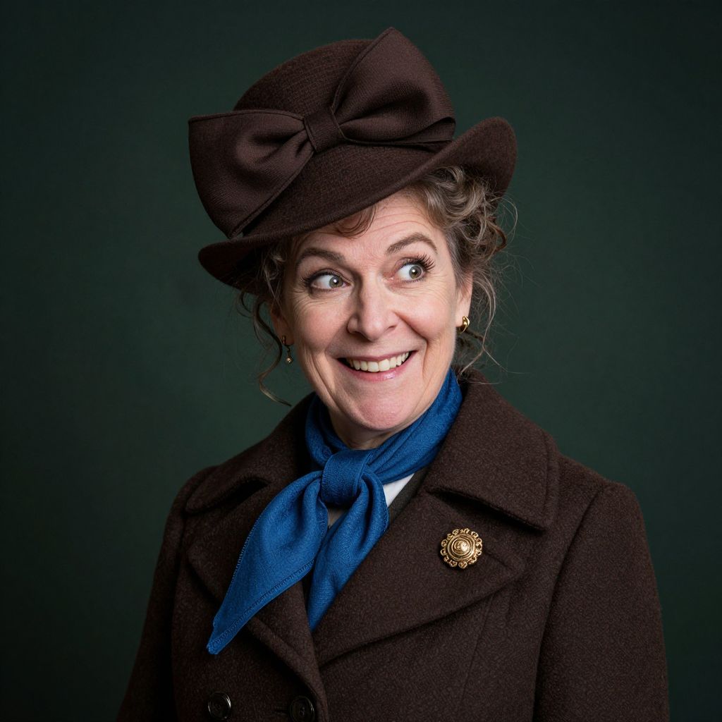 A mischievous, wealthy middle-aged Victorian woman with a mischievous expression, slightly grinning, wears a brown hat adorned with a large bow, a blue scarf, and a brown coat with a gold brooch, set against a dark green background.
