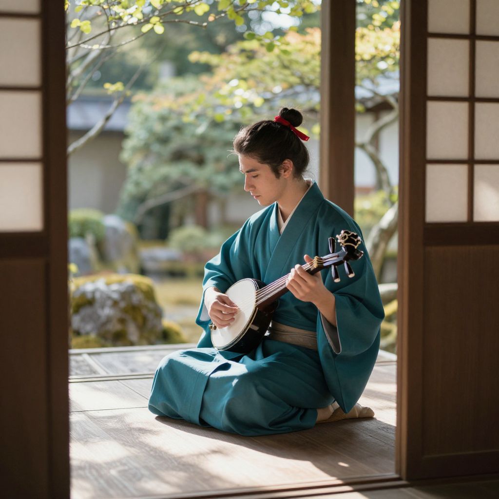A tranquil scene featuring a young man dressed in a flowing teal traditional kimono, seated in a wooden open-air pavilion, His hair is tied in a loose, elegant bun with a red ribbon, complementing the serene aesthetic of the setting, He holds a traditional Japanese shamisen, his fingers poised as if mid-play, exuding a sense of calm and focus, The pavilion is bathed in soft sunlight filtering through the lattice windows, casting intricate shadows on the wooden floor, The backdrop reveals a lush garden, with delicate greenery and dappled light that enhances the peaceful atmosphere, The overall composition emphasizes a harmonious blend of culture, nature, and music, creating a timeless and contemplative moment