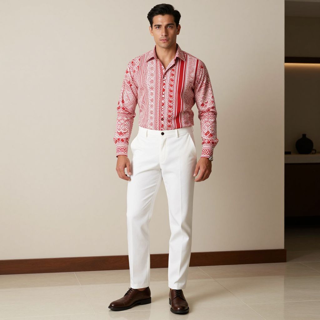 A man wearing a red and white patterned shirt and white pants with brown shoes, with a confident and stylish posture, standing in a well-lit, neutral-colored room with a modern decor. The shirt has a classic, vintage-inspired design with bold red and white stripes, while the pants are crisp and well-fitted, complementing his athletic build. The brown shoes add a touch of sophistication, and the overall scene exudes a sense of casual elegance. The lighting highlights his features, creating a balanced and flattering composition.