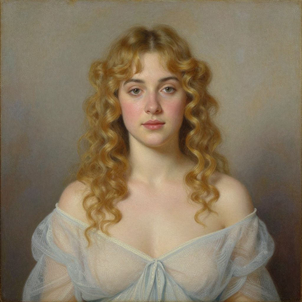 Classical portrait painting of a fair-skinned woman with curly, auburn hair, wearing a sheer, white off-shoulder gown, against