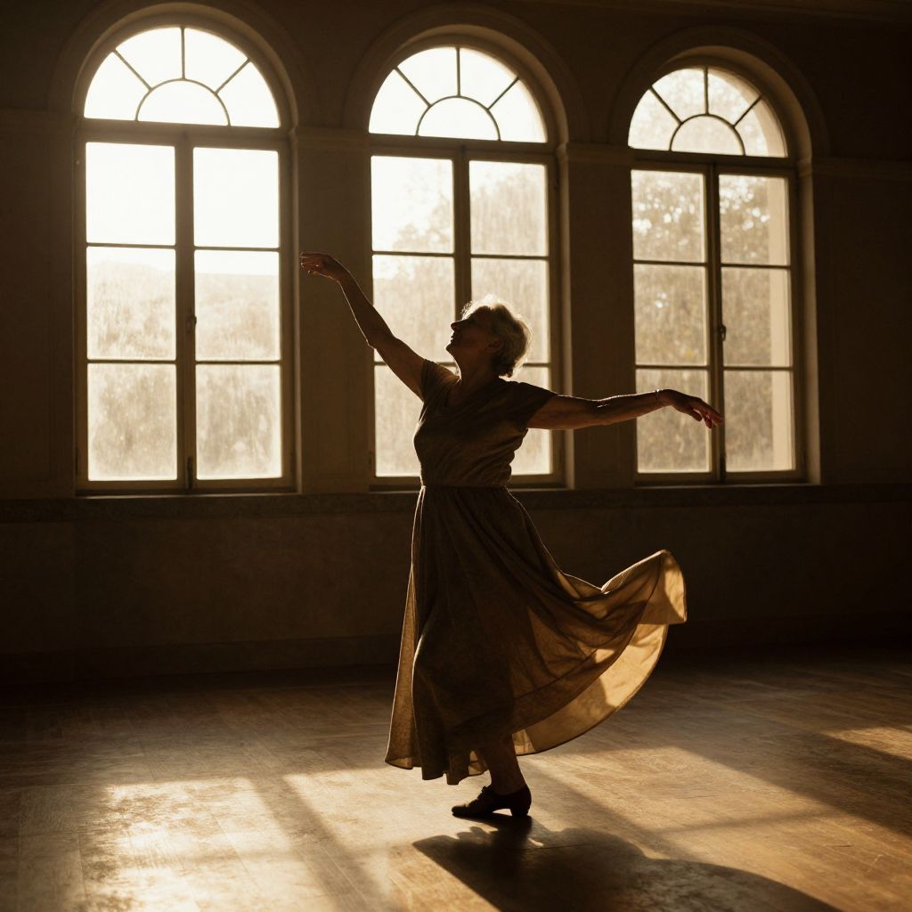 Amidst the golden embrace of sunlight streaming through ancient windows, an elderly woman dances with the shadows, her silhouette soaring upward like a liberated spirit, embodying the timeless dance between freedom and memory.