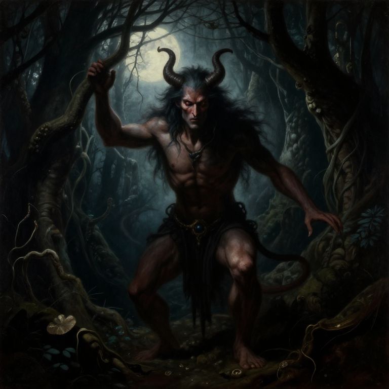 Azazel painting illustrating a powerful demon-like entity emerging from the depths of an ancient forest, illuminated by eerie moonlight filtering through twisted branches, combining elements of fantasy and dark Renaissance art with high contrast shadows.