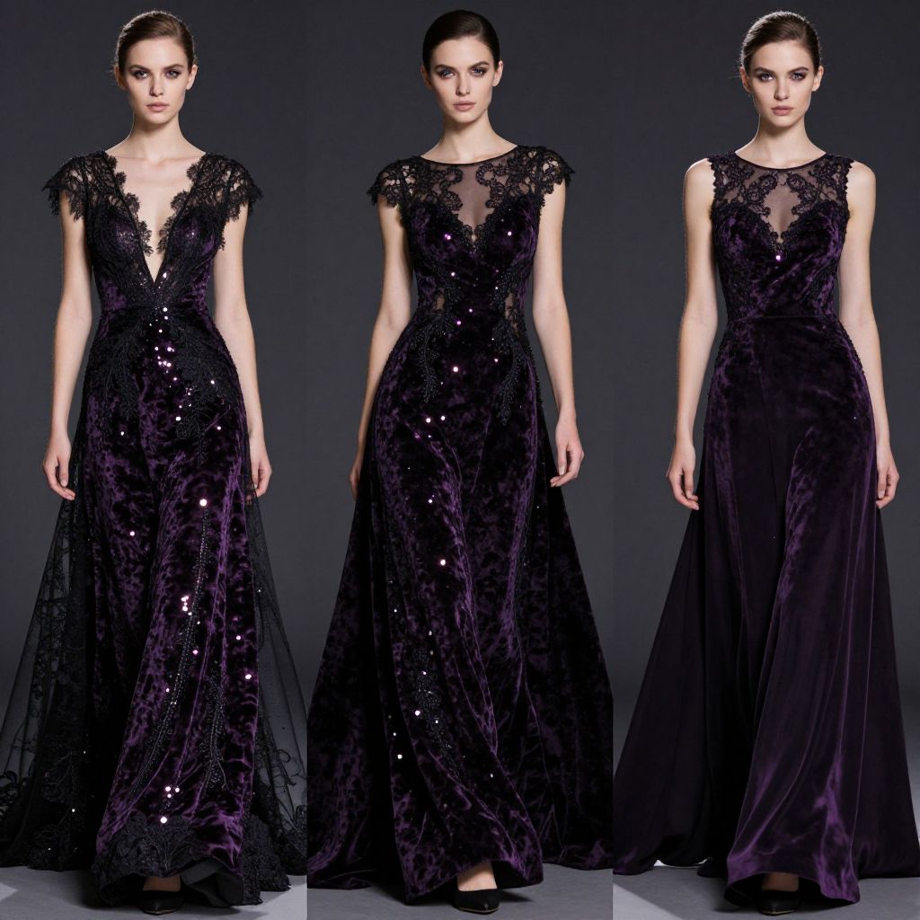 Dark purple and black color palette showcased in an elegant fashion design, featuring flowing velvet gowns with shimmering black lace details, dramatic lighting emphasizing the rich deep tones, high fashion editorial style.