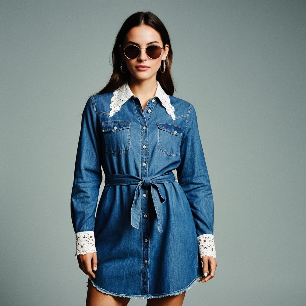 Woman, casual, denim shirt dress, medium wash, long sleeves with button cuffs, white lace detail on shoulders and back yoke, pointed collar, full-length button placket, self-tie waist belt, thigh-length, oversized sunglasses, dangle earrings.