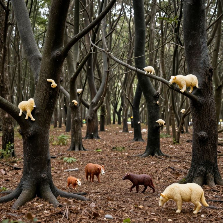 Photograph of a forest with yellow sheep, brown and black goats, and a cream-colored dog, all climbing dark, bare trees with a brown,