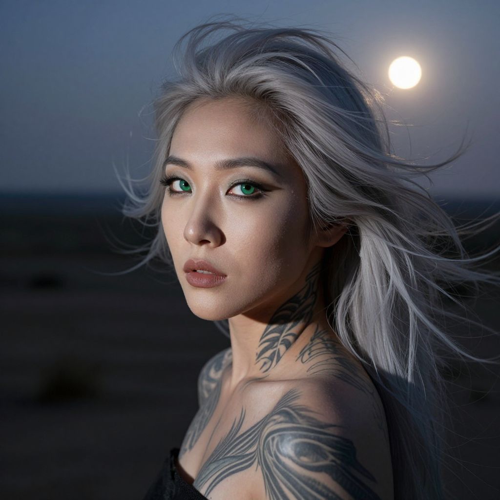 Photograph of an Asian woman with long, silver-gray hair blowing in the wind, illuminated by a full moon in a dark, oceanic background. She has striking green eyes, full lips, and intricate black tattoos on her shoulders and neck. She is wearing a black, sleeveless top. The moonlight casts a soft glow on her face, highlighting her smooth, fair skin. Her expression is serious and intense, with a slight tilt of her head. The image has a dramatic, ethereal quality, emphasizing her otherworldly appearance.
