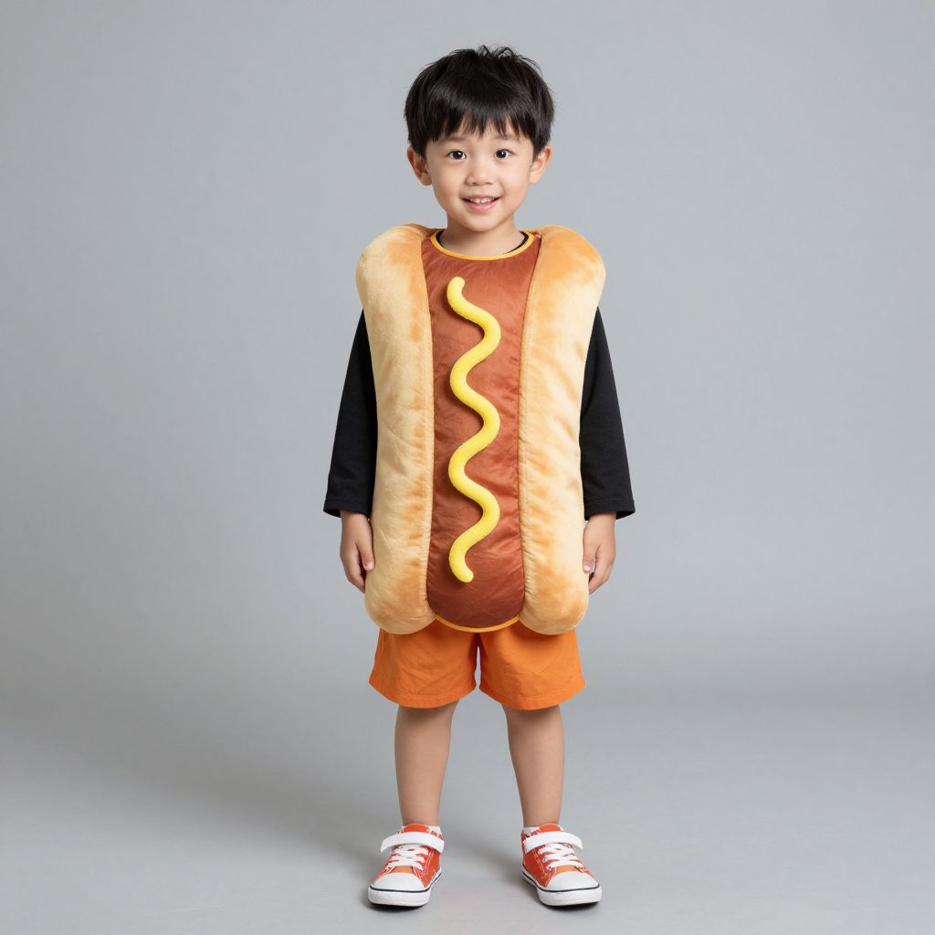 Photograph of a young Asian boy standing against a plain light gray background. He has short black hair, a slight smile, and is wearing a costume resembling a hot dog. The costume has a textured, light brown bun with a yellow wavy line in the center, mimicking mustard. He also wears a black long-sleeve shirt, orange shorts, and red and white sneakers. The costume covers his chest and extends down to his waist. The lighting is even, highlighting the costume's details and the boy's cheerful expression.
