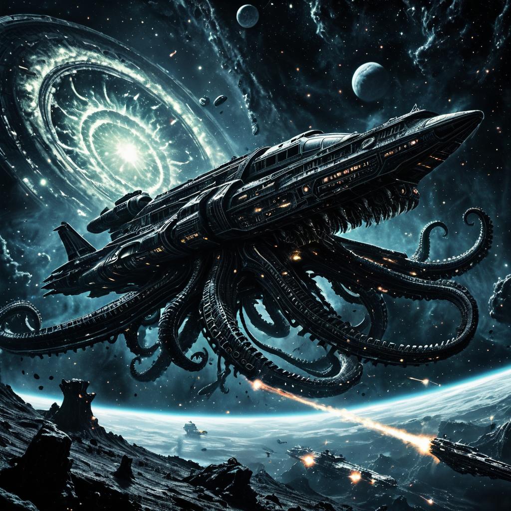 Illustration in the style of H.R. Giger, a space battle between tentacle-covered battlecruisers with a glowing nebula in the background, as seen from space