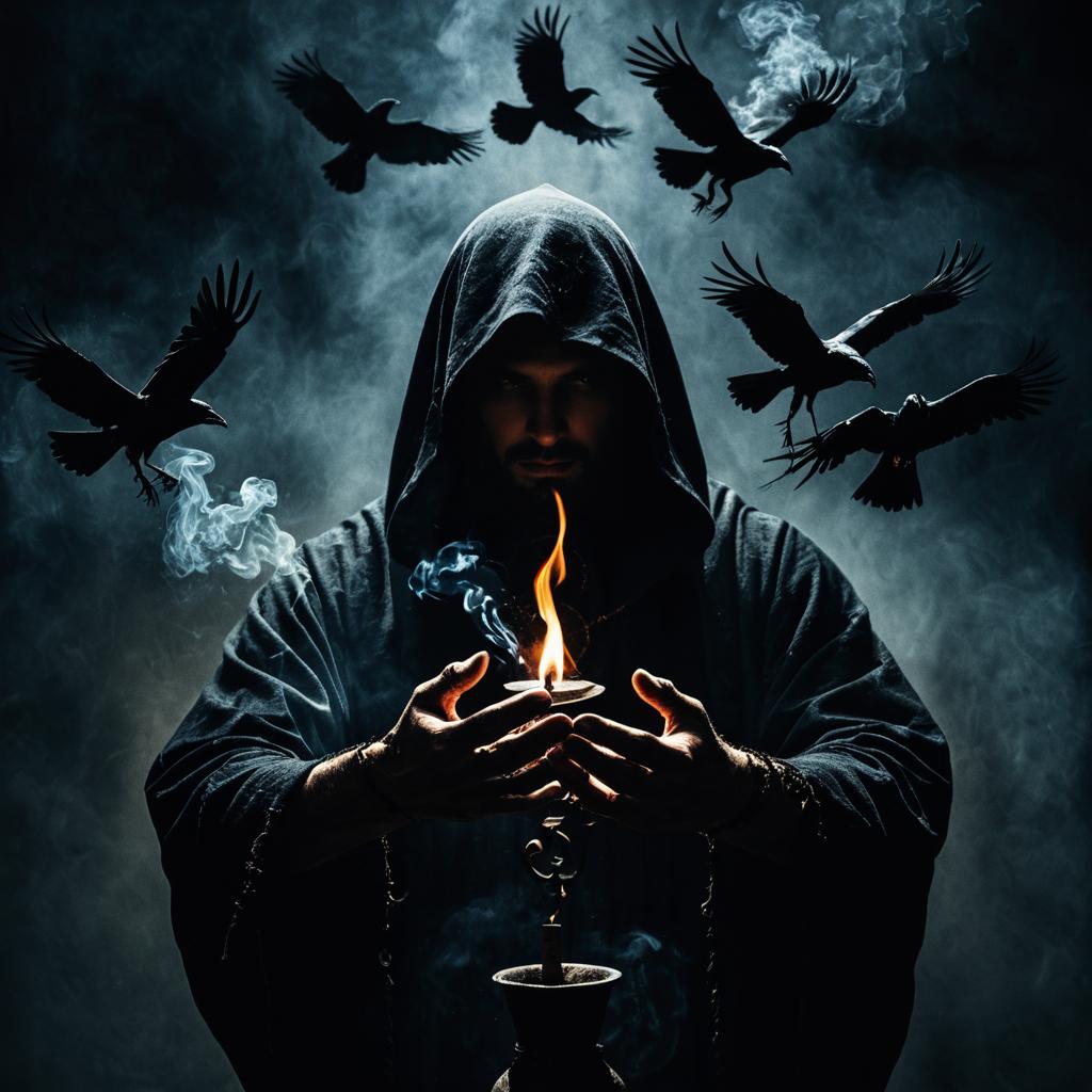 A group of people dressed in black robes wearing skull masks participate in a mystical voodoo ritual. The central figure, a voodoo priestess, is seated in front of a fire bowl with burning incense, surrounded by smoky blue shadows. The participants' hands are raised, emphasizing the supernatural atmosphere of witchcraft and occult ceremony in a dark setting.