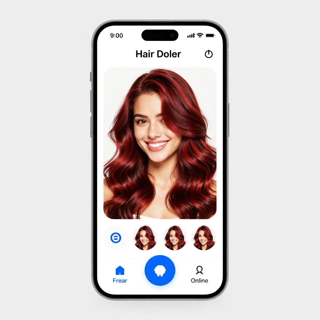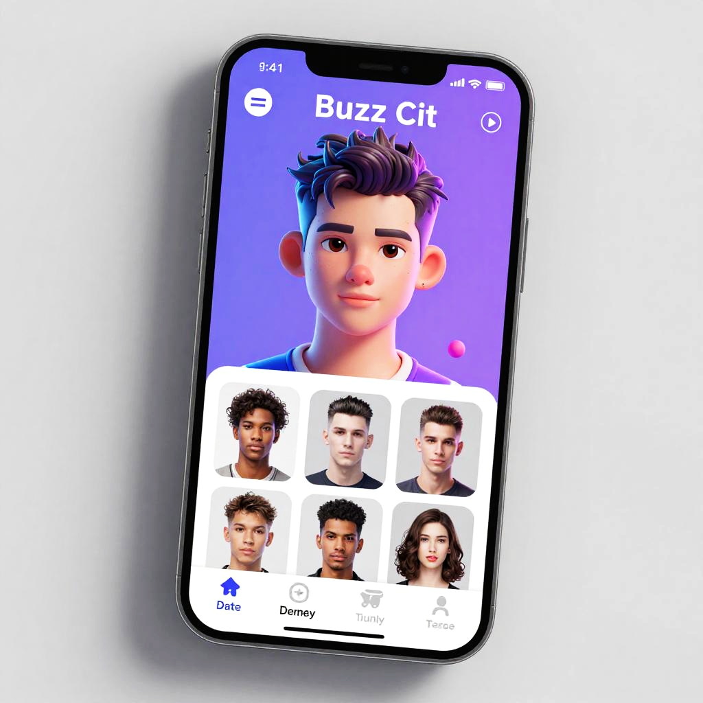 Is there a buzz cut filter on a futuristic smartphone app, showing a array of digital hairstyles, high-tech interface, neon lights, sleek user experience design, realistic 3D rendering with soft shadows, cyberpunk aesthetic.