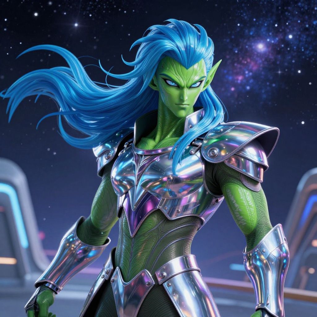 Zarbon, the elegant alien warrior from a futuristic universe, with shimmering emerald skin, long flowing blue hair, metallic armor reflecting a neon-lit battlefield, intense gaze under a starry cosmic backdrop, intricate details, dynamic pose, high resolution.