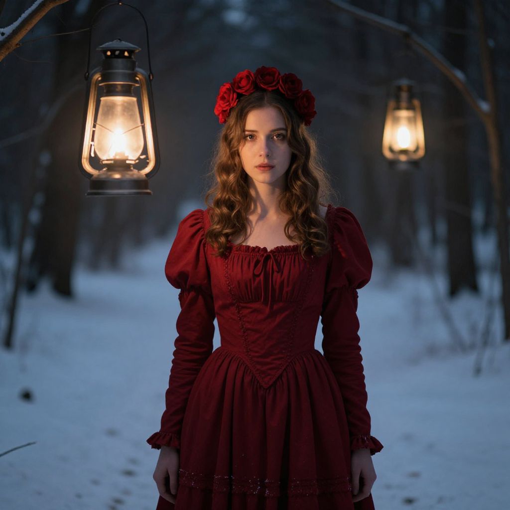 Photograph of a young woman with long brown hair, wearing a white shirt and black skirt, holding a lit candle in a dimly lit, narrow