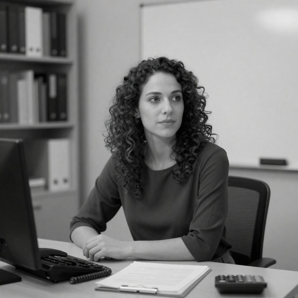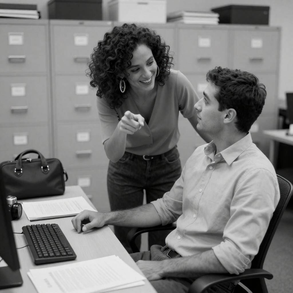 Black and white photograph of a man and woman in an office. Woman with curly hair, large earrings, leaning forward, smiling, pointing. Man with short hair, light shirt, sitting, looking up at her. Desk with papers, bags, and a camera. Background with filing cabinets. Woman's hand on man's shoulder. Intense, engaging expressions.