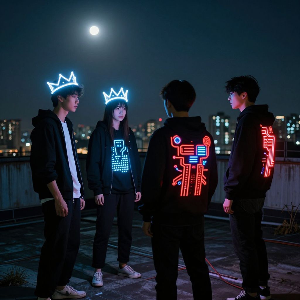 Photograph of four young Asian individuals wearing neon-lit crowns and jackets, standing on a rooftop at night, illuminated by moonlight and city lights