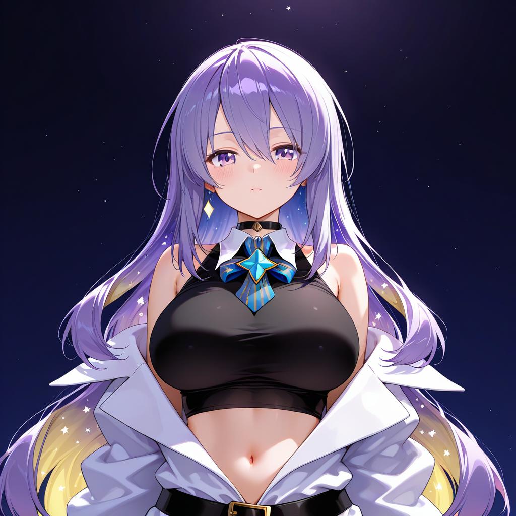 Moona hoshinova (1st costume), hololive, 1girl, purple eyes, hair between eyes, purple hair, starry hair, colored inner hair, blonde hair, long hair, gradient hair, two-tone hair, very long hair, large breasts, navel, white jacket, black shirt, sleeveless shirt, off shoulder, black choker, bare shoulders, virtual youtuber, virtual youtuber, crop top, star (symbol), midriff, by artist kl, illustrious