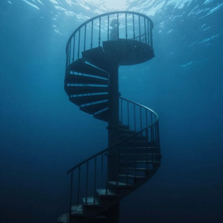 An ethereal spiral staircase winds upward through the depths of an oceanic abyss, inviting introspection into the infinite expanse of the soul, where the weightless embrace of the sea whispers secrets of eternity and the quiet mystery of existence.