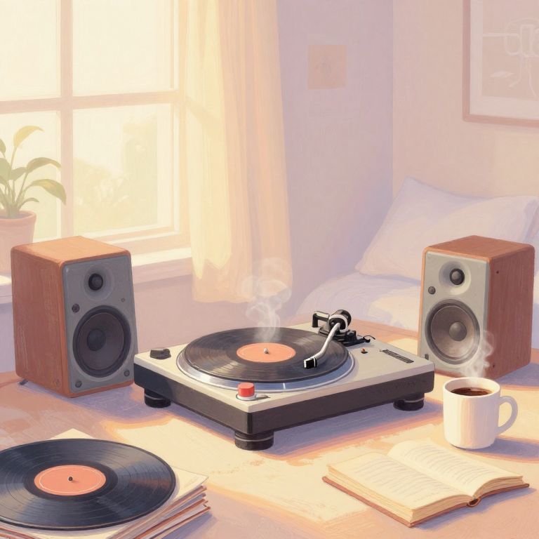 The album cover is a beautifully crafted illustration that perfectly captures the chilled-out and relaxing vibe of lo-fi hip hop music. The scene is set in a cozy, inviting bedroom or living room, bathed in soft, warm light that creates a dreamy and hazy atmosphere. Pastel colors and gentle brush strokes evoke a feeling of calm and serenity. In the center of the composition, a turntable, speakers, or a music player is placed, with soft, mellow music emanating from the speakers, inviting the listener to sit back, relax, and lose themselves in the mellow and soulful sounds of the music. Characteristic elements of lo-fi hip hop culture, such as a mug of steaming coffee, a stack of vinyl records, and a dusty old book, add to the cozy and comfortable ambiance. The overall impression is one of coziness, comfort, and tranquility, perfectly encapsulating the essence of lo-fi hip hop music.