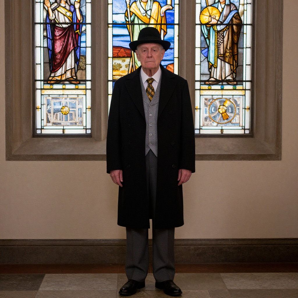 Elderly man in black overcoat, gray vest, tie, and hat stands in front of colorful stained glass windows, church setting.