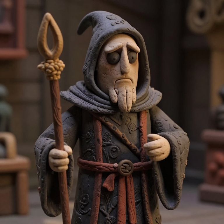 A detailed, CGI-rendered image of a melancholic, stone-like wizard. He has a long, pointed hat with drooping ends, a beard, and a solemn expression. His cloak is textured with intricate patterns, and he wears a belt with a circular buckle. The wizard holds a wooden staff with a decorative top in his right hand. The background is blurred, featuring dark, medieval-style architecture with wooden elements. The image has a realistic yet slightly whimsical, fantasy art style, emphasizing textures and shadows to enhance the character's somber appearance.