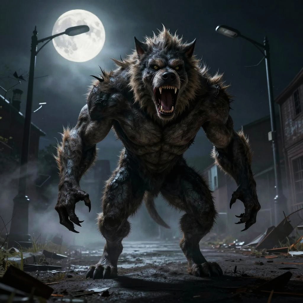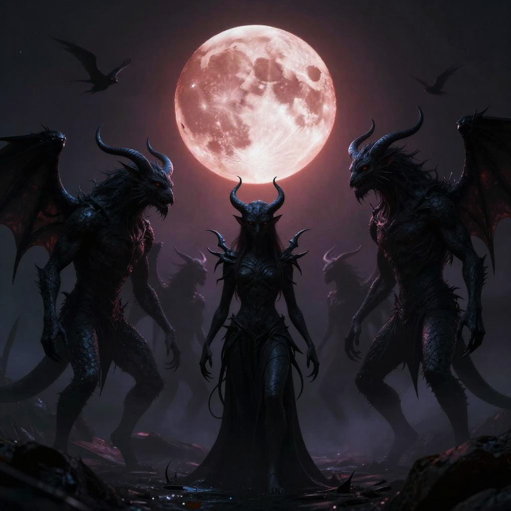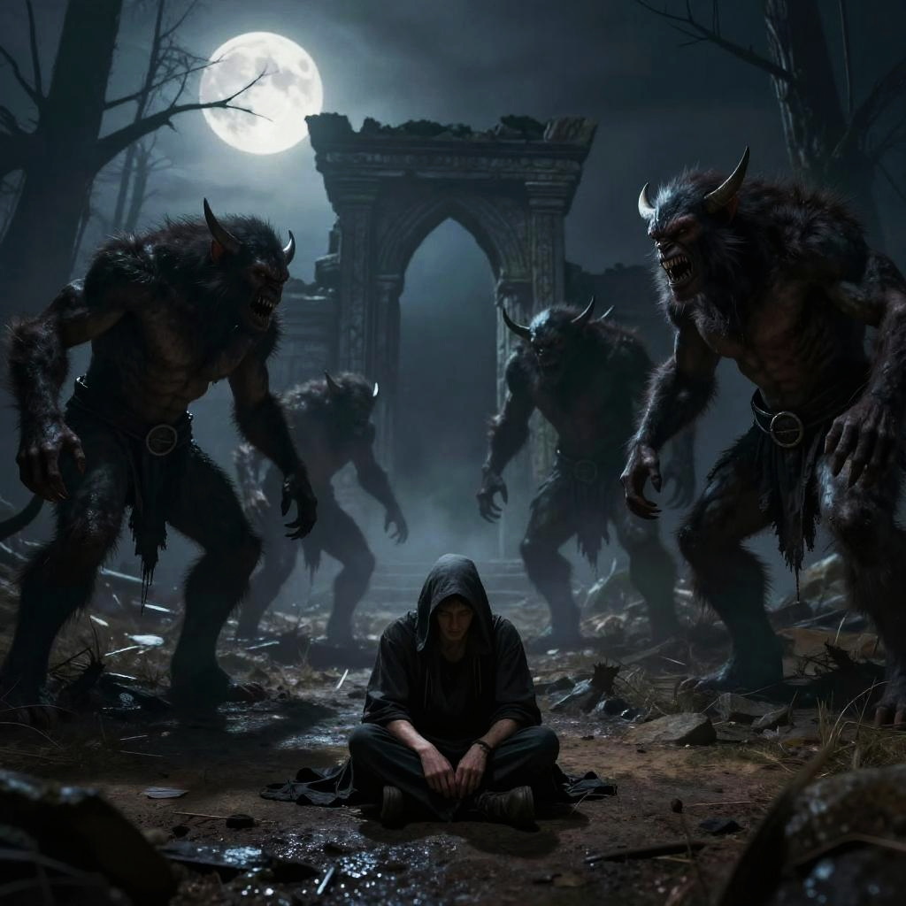 Prisoner of the gnolls, a lone figure trapped in gnoll territory, eerie moonlight casting shadows on savage gnolls, ancient ruins nearby, dark fantasy style, intense mood