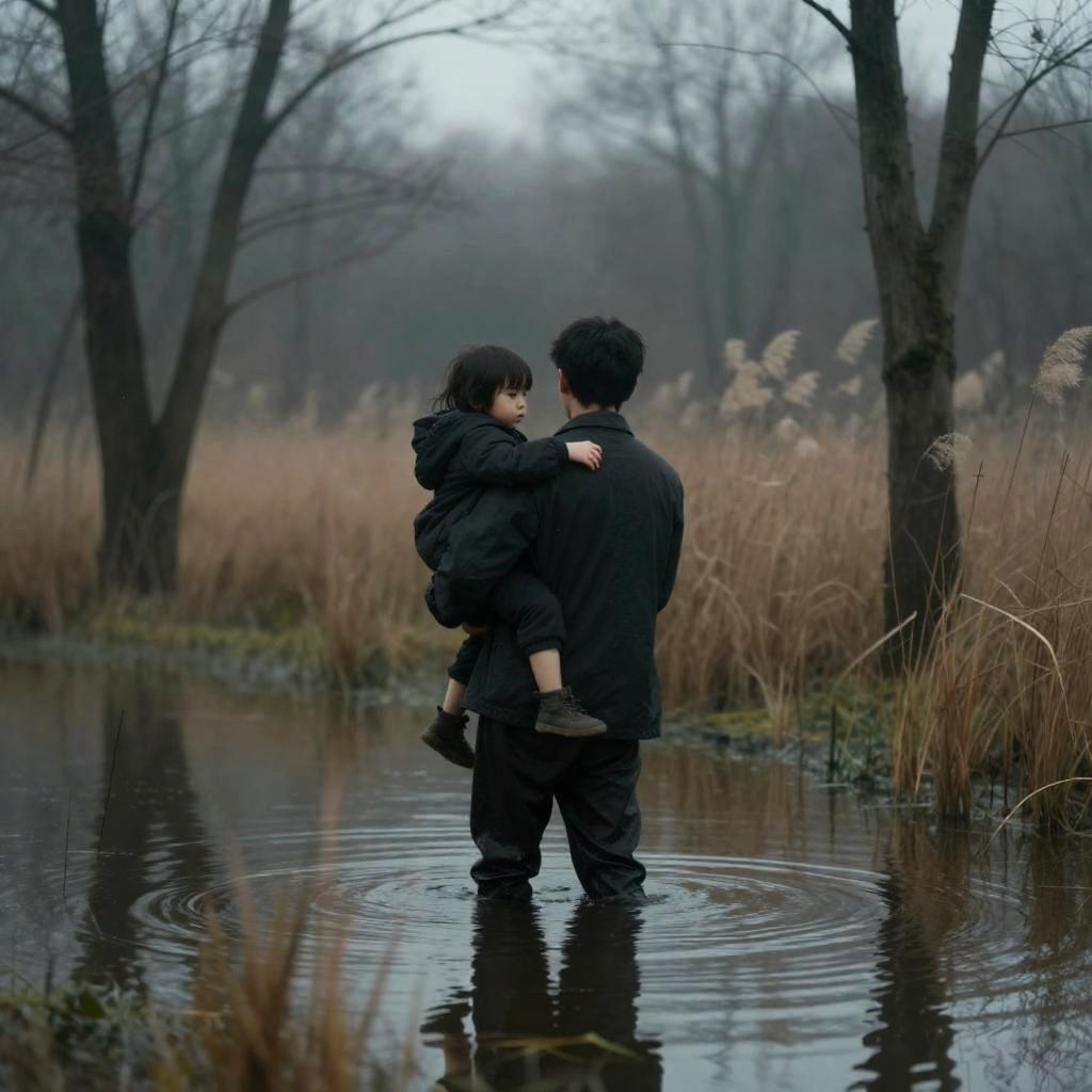 Black and white photograph of two people in a small wooden rowboat on a calm lake. One person rows while the other sits with a child. Dense forested mountains in the background. Both people have short hair and casual clothing. Boat reflects on the lake. Rower has focused expression. Child sits between rower and passenger.
