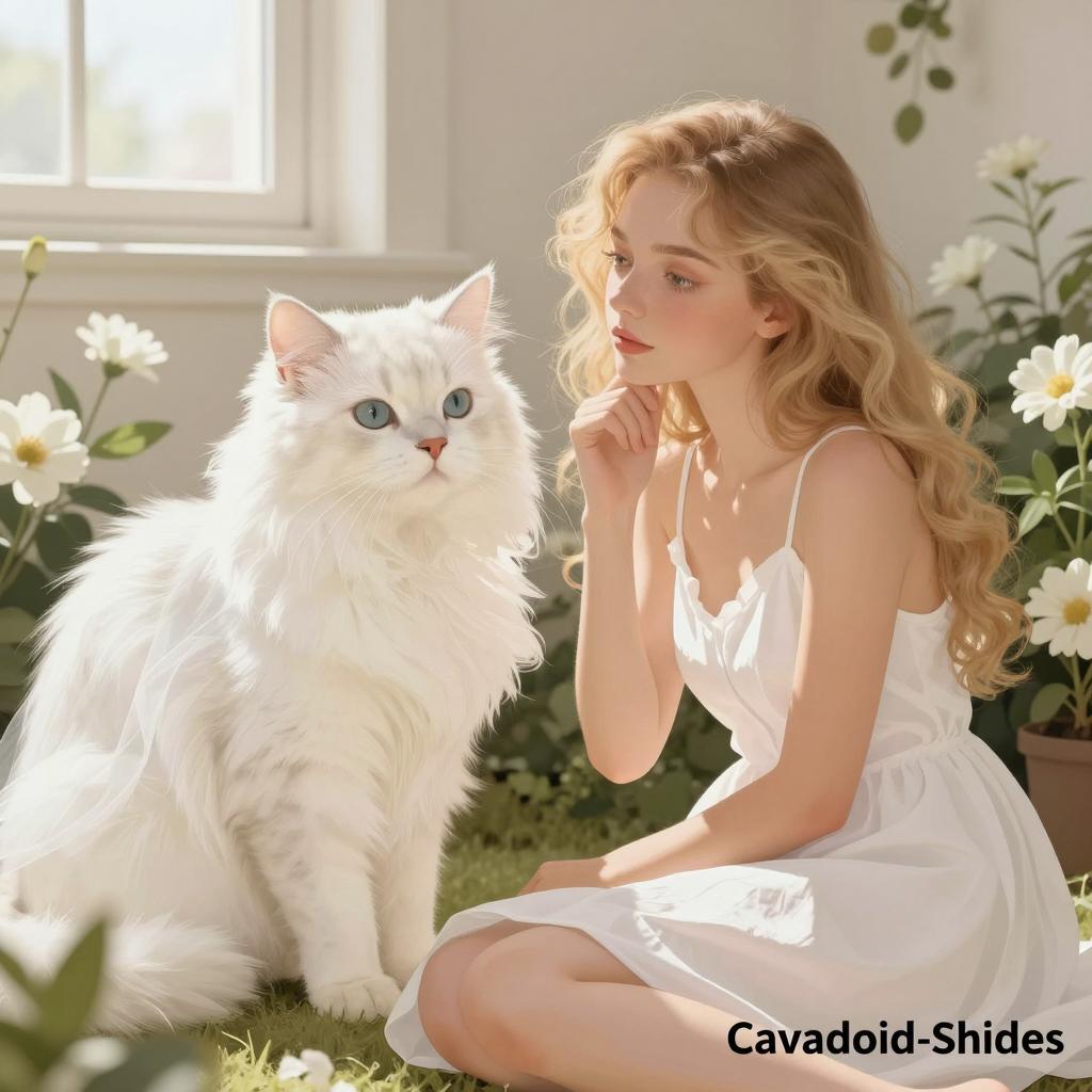 Illustration of a woman with wavy blonde hair and a white dress, sitting next to a large, fluffy white cat. She has a relaxed expression, her right hand near her chin. The cat is draped in a sheer white fabric, looking slightly to the side. They are surrounded by white flowers and green foliage. Sunlight streams through a window in the background. Cavadoid-Shide's is in the bottom right corner.