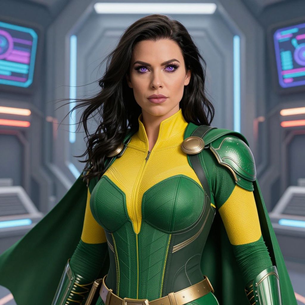 Digital artwork of a confident, dark-haired woman in a green and yellow superhero costume with metallic shoulder armor, in a futuristic, neon-lit room.