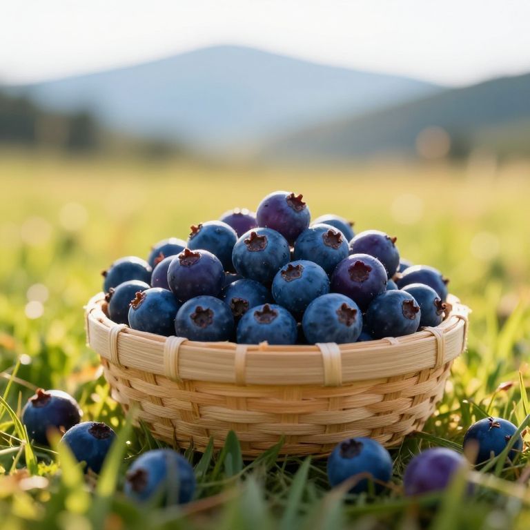 A basket overflowing with fresh arandanos, set in a sunlit meadow with distant mountains, soft bokeh background, early morning light creating a golden hour effect, rich blue and purple hues of the berries emphasized, nature and purity theme