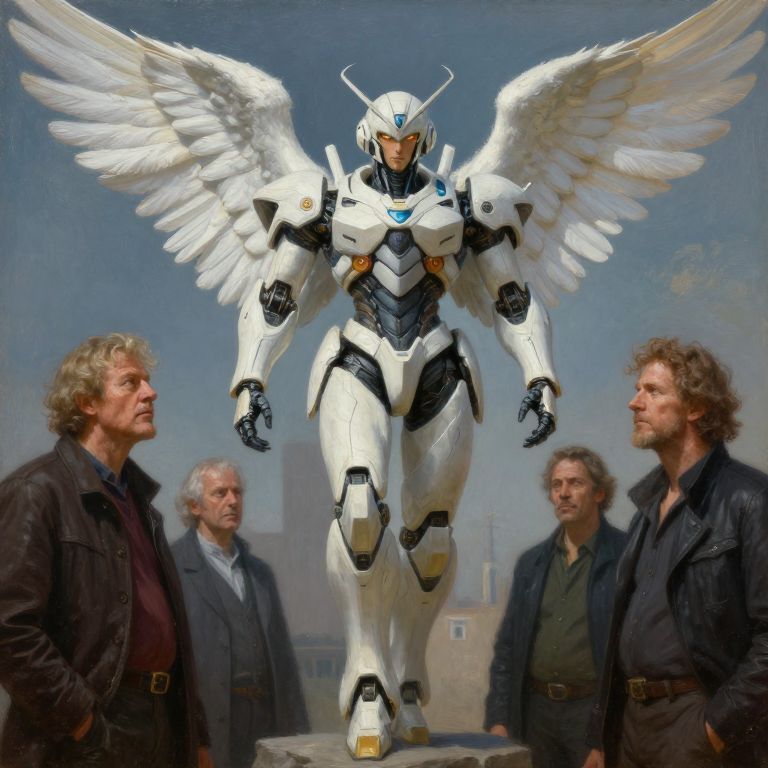 Photorealistic CGI image of a humanoid robot with white and black armor, large white angel wings, and blue accents, standing on a pedestal. Three middle-aged men with curly hair, dressed in dark jackets, observe from the left and right. The background features a clear blue sky and a blurred urban landscape. The robot's design is sleek and futuristic, with a confident stance, and the men's expressions are serious and focused. The overall mood is a mix of awe and curiosity.