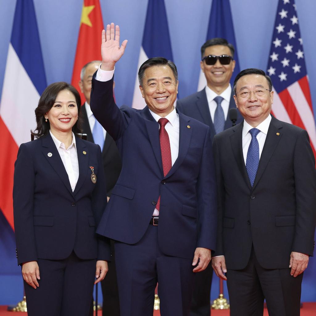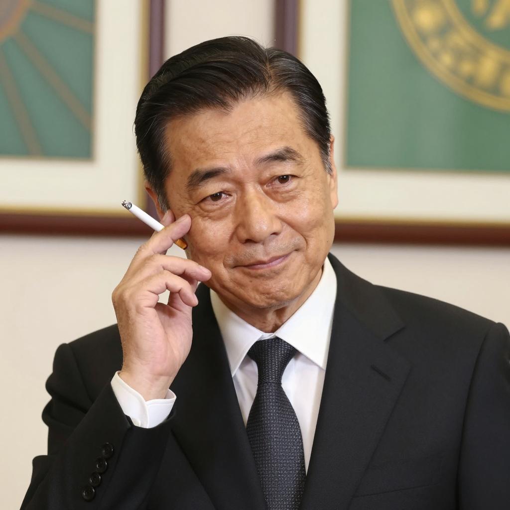 Portrait of an Asian man wearing a dark blue suit, white shirt, and striped tie, standing indoors with hands resting on a black railing. He is looking upwards with an intense expression. The background features a red flag with a white crescent and star, representing Turkey.