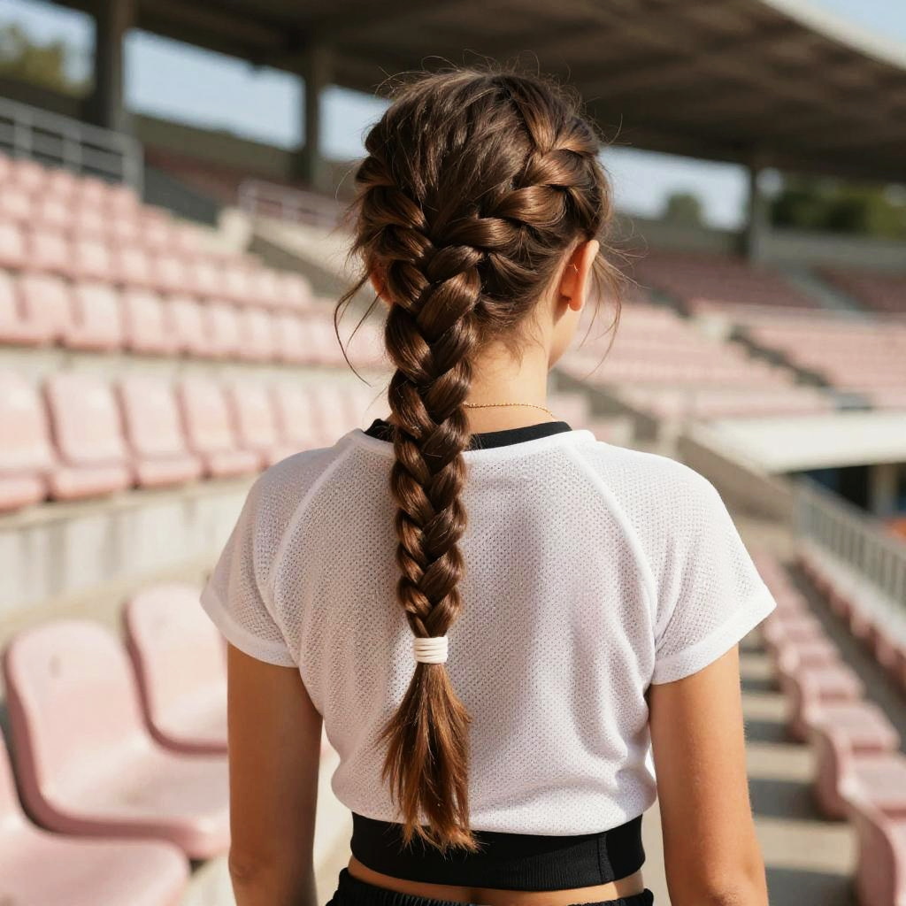 Mini Twists hairstyle on young female athlete, wearing athletic wear with mesh top, in stadium seating area, captured in fashion editorial style with natural harsh daylight.