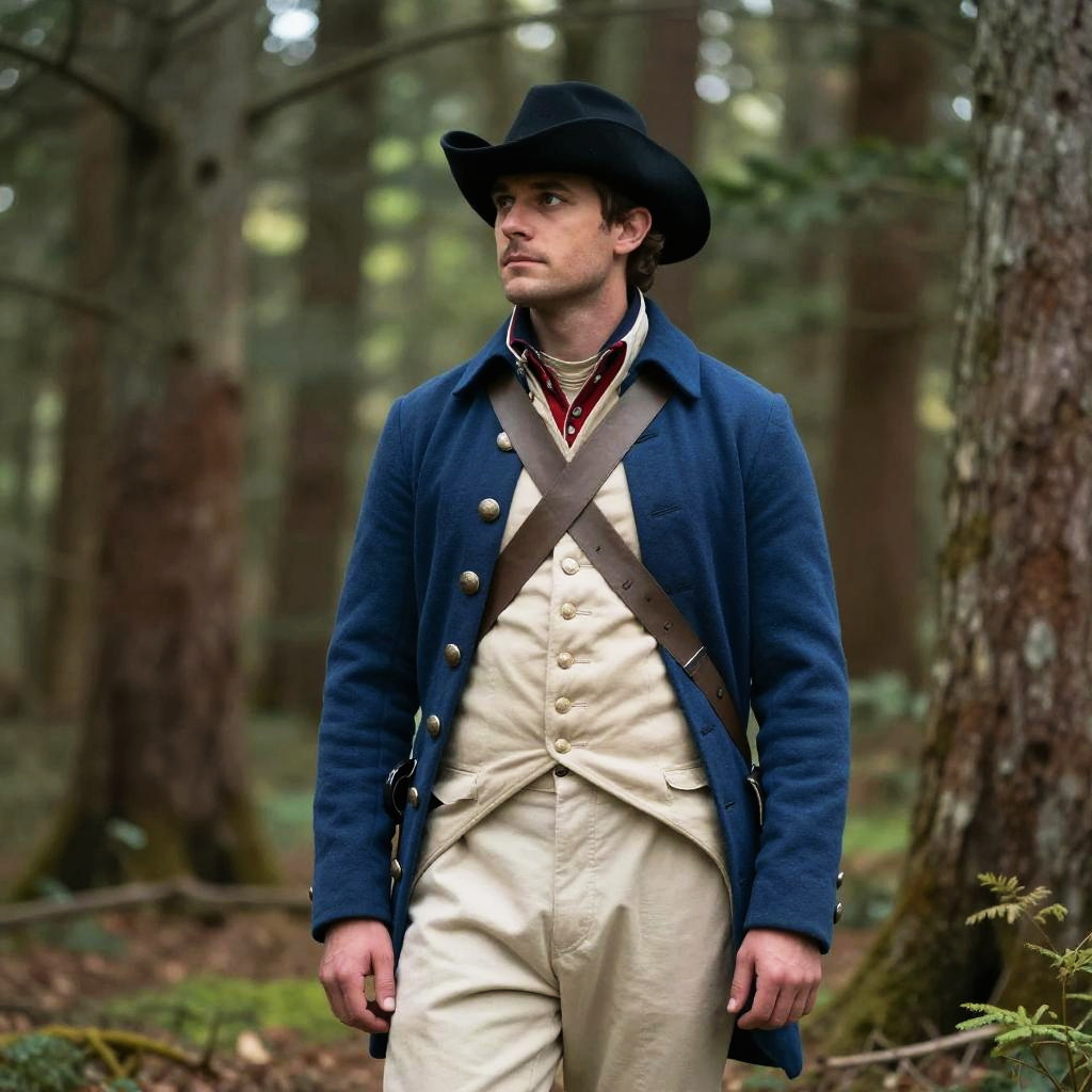 Revolutionary War Costume Adult, man in a blue coat and hat standing in a forest