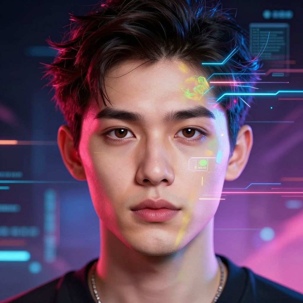 Photograph of an Asian man with short black hair, glowing neon lights on his forehead, and cybernetic overlay, against a dark, futuristic background