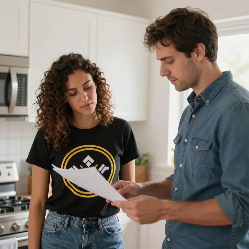 Photograph of three people in a kitchen. Elderly man with gray hair, glasses, and black shirt sits at table, holding paper. Middle-aged woman with dark hair, brown top, stands with arms crossed. Young man with brown hair, gray long-sleeve shirt, pours food from striped bag into bowl. Warm lighting, kitchen cabinets, fruit bowl on table. Elderly man smiles, middle-aged woman has neutral expression, young man looks down.