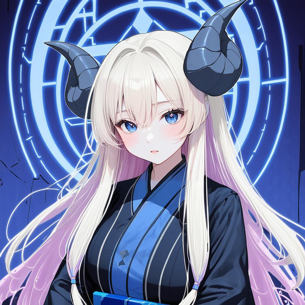 Digital anime-style portrait of a blonde girl with very long hair and black demon horns. She has blue eyes with pink heart-shaped pupils and wears a black kimono with blue accents and black gloves. A glowing blue magical circle halo is visible behind her, enhancing the mystical and fantasy theme. The artwork features intricate hair details, including a braid and ahoge, in a style inspired by artist Kyogoku Shin.