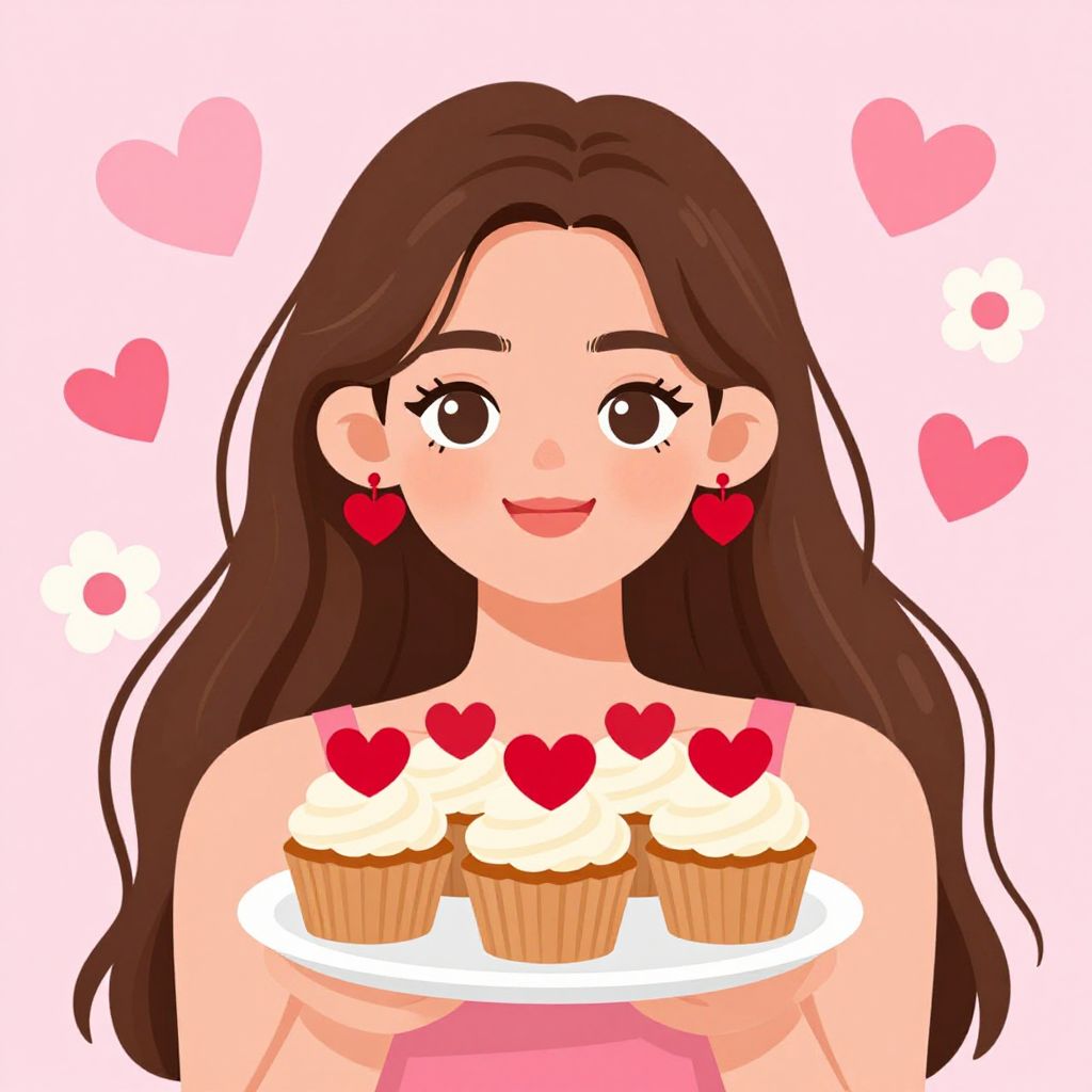 Digital illustration of a smiling woman with long brown hair, red heart earrings, holding a plate of cupcakes with red hearts. Background features pink hearts and flowers