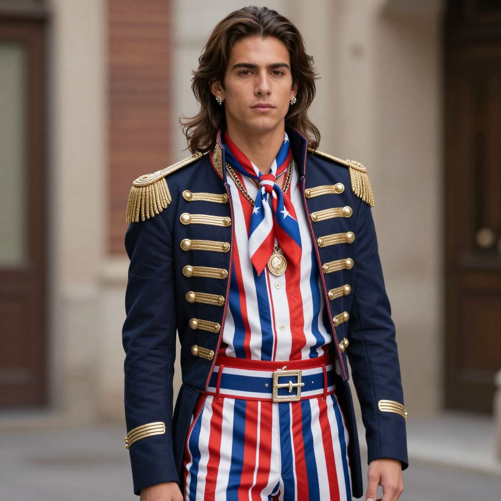 Photograph of a young man with long, wavy brown hair, wearing a navy blue military-style coat adorned with gold epaulettes and stripes. He pairs the coat with a red, white, and blue vertically striped shirt and matching trousers, both featuring a central red and blue tie. The background shows a blurred urban street with beige and brick buildings. The man's expression is neutral, and he stands confidently, creating a striking contrast between his colorful attire and the muted background. The image has a vibrant, almost cinematic quality.