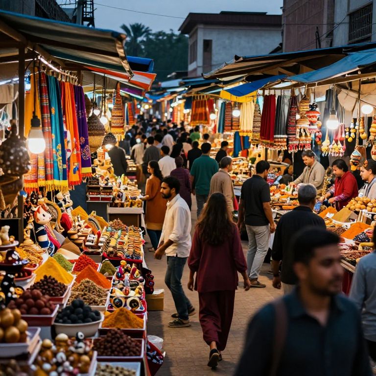 Balagan scene in a bustling marketplace at twilight, chaotic stalls brimming with colorful fabrics, spices, and strange trinkets, lively crowd, dynamic motion, vibrant warm tones, rich texture detail, festive and energetic atmosphere, cinematic lighting