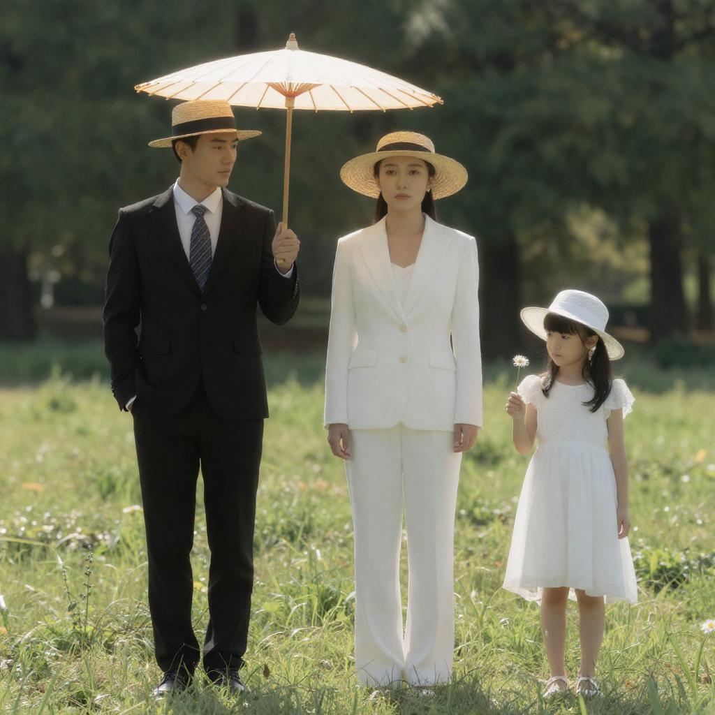 Photograph of a couple in a lush forest. Woman in white dress with large hat stands facing right, holding plant. Man in white shirt and dark pants stands slightly behind her, facing left. Dense green foliage surrounds them. Sunlight filters through trees. Man's expression is neutral, woman's expression is not visible. Tree stump with small bowl on right.