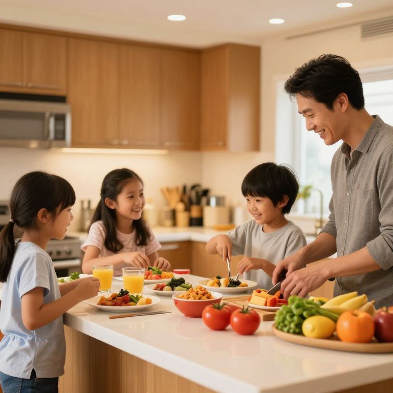 Photograph of a happy Asian family preparing a meal in a modern kitchen. A smiling father with short black hair in a gray shirt serves colorful vegetables and fruit to his three children, two girls and one boy, all with black hair. The girls wear light-colored shirts, and the boy wears a white T-shirt. The kitchen features wooden cabinets, a stainless steel oven, and a bright, white-tiled backsplash. The white countertop is adorned with a bowl of fresh fruits, including oranges, apples, and tomatoes. The children sit at the counter, enjoying their food and each other's company.