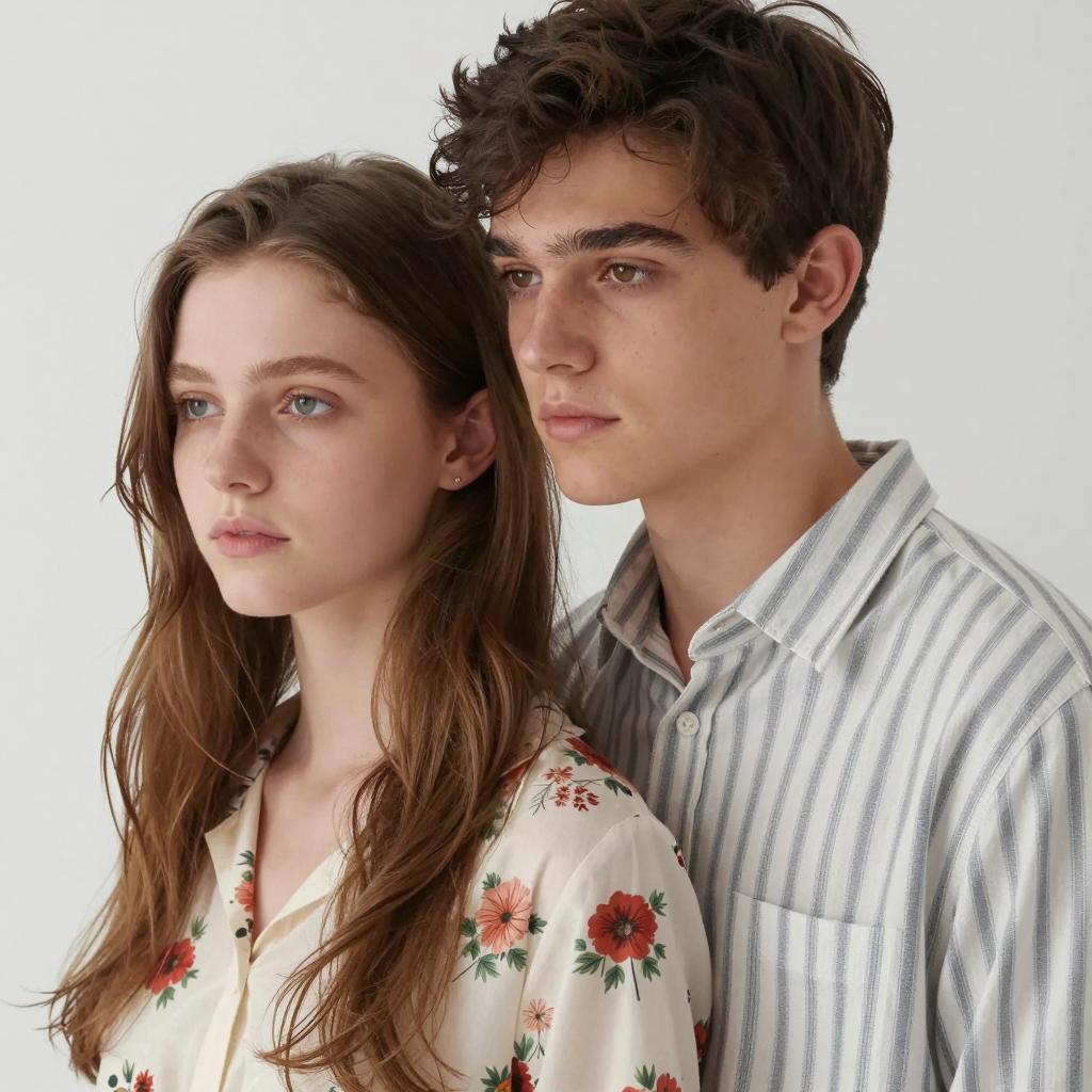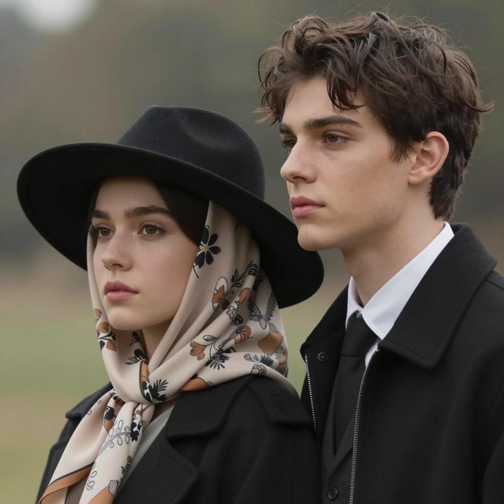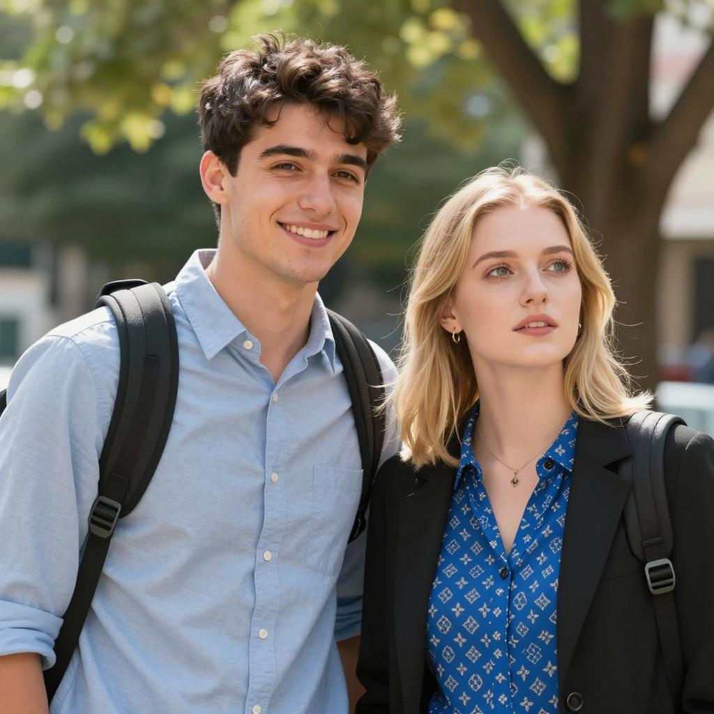 Three young people in close-up. Man on the left with dark hair, serious expression, wearing black jacket. Woman in the middle with brown hair, intense gaze, wearing brown shirt. Woman on the right with blonde hair, slight smile, wearing purple sweater. All three have their heads close together, man's hand on woman in the middle's shoulder. Background is blurred, light-colored building.