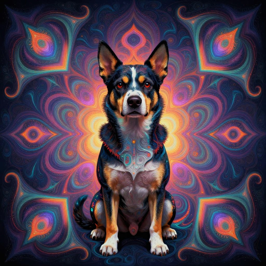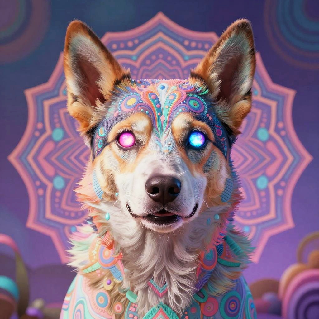 Psychedelic dog art showing a whimsical dog with glowing eyes, layered with vivid pastel and neon hues, intricate mandala patterns blending into the environment, surreal atmosphere