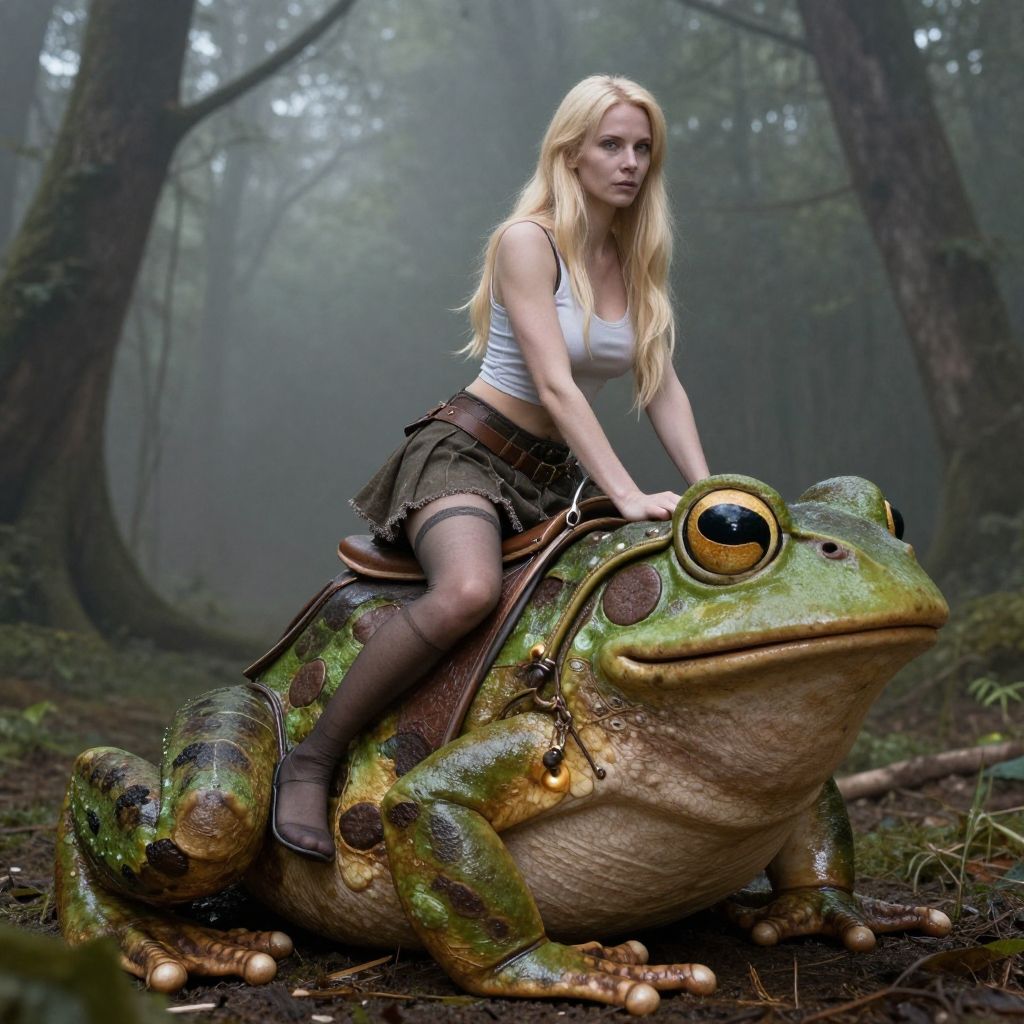 Photograph of a blonde woman with long hair, wearing a white sleeveless top, brown skirt, and black stockings, sitting on a giant, green, frog-like creature with large yellow eyes in a misty forest. The creature has textured, bumpy skin and is adorned with a brown leather saddle. The background features tall trees and dense foliage, with light filtering through the mist, creating a mysterious, enchanted atmosphere. The woman's expression is focused and determined. The image has a surreal, fantasy-like quality.